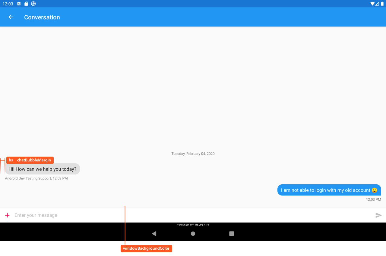 - Create a style named Helpshift.Theme.Base and set its parent to your custom helpshift theme.